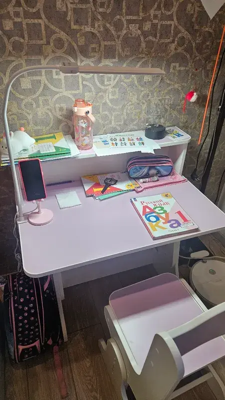 Комплект хороший, по весу тяжеленький. Собирала сама. Разобралась. Собрала на второй уровень высоты сразу. Для роста 122 ножки ребенка пока не стоят ступнями на полу, но скоро подрастет,поэтому сразу так. Потому что, чтобы регулировать высоту стола и стула,это надо откручивать снова по бокам. Ширина нормальная для положения рук. Для учебников полочка. Дочка выбирала,ей понравился.